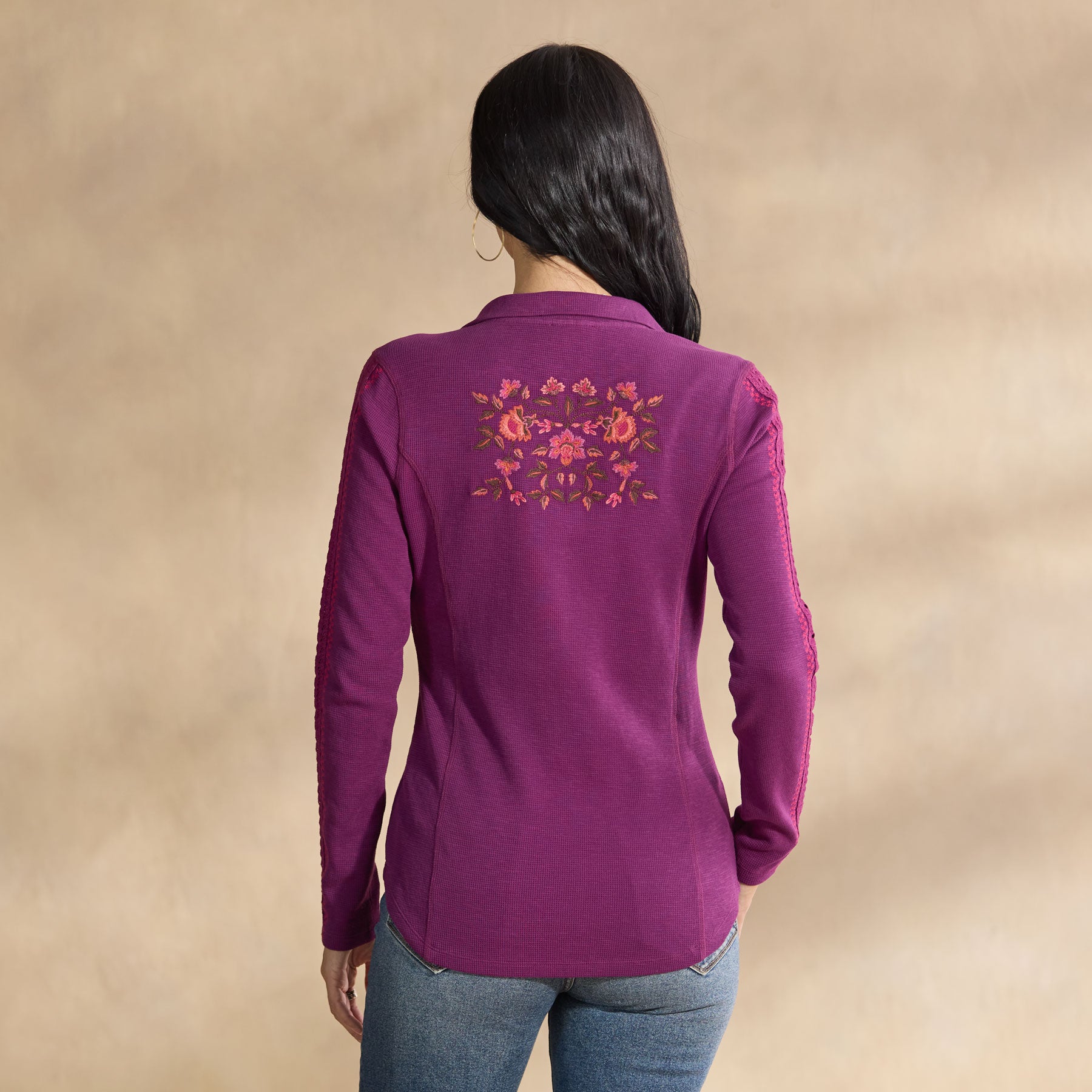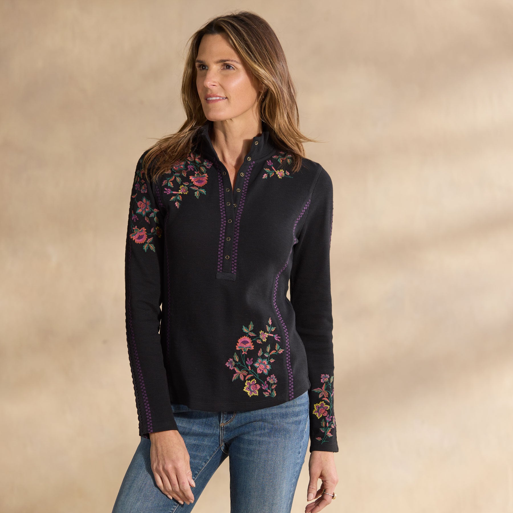 So flattering. our mock neck henley is blooming with stunning. multi colored floral embroidery. feminine lace insets at the sleeves and metal snaps at the placket. Princess seams. Cotton. Machine wash. Imported. Exclusive. Sizes XS (0–2). S (4–6). M (8–10). L (12–14). XL (16–18). XXL (20–22). Approx. 25l.