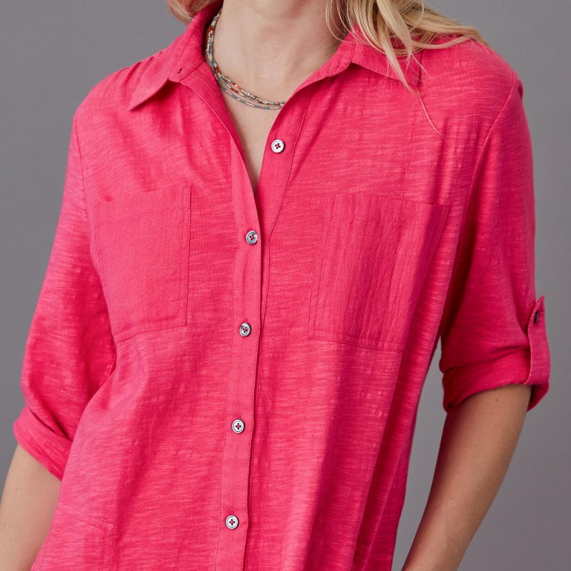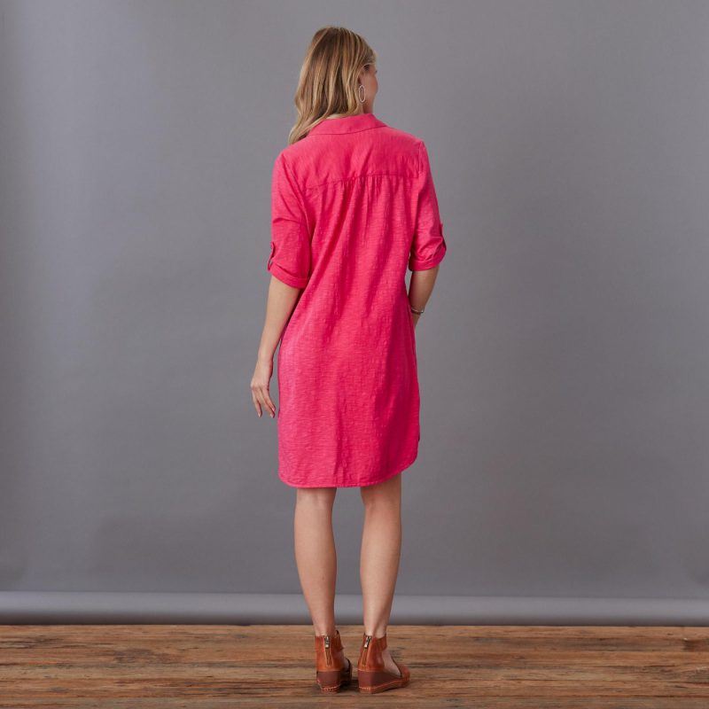 Easy and relaxed. our button front shirt dress is knit in a cozy fabric with woven front pockets. roll tab sleeves and smoke shell buttons. Shirttail hem. Cotton. Machine wash. Imported. Exclusive. Sizes XS (0-2). S (4-6). M (8-10). L (12-14). XL (16-18). XXL (20-22). Approx. 36l.