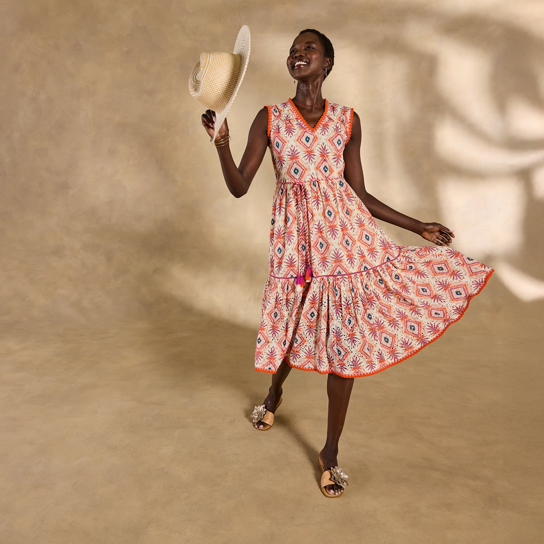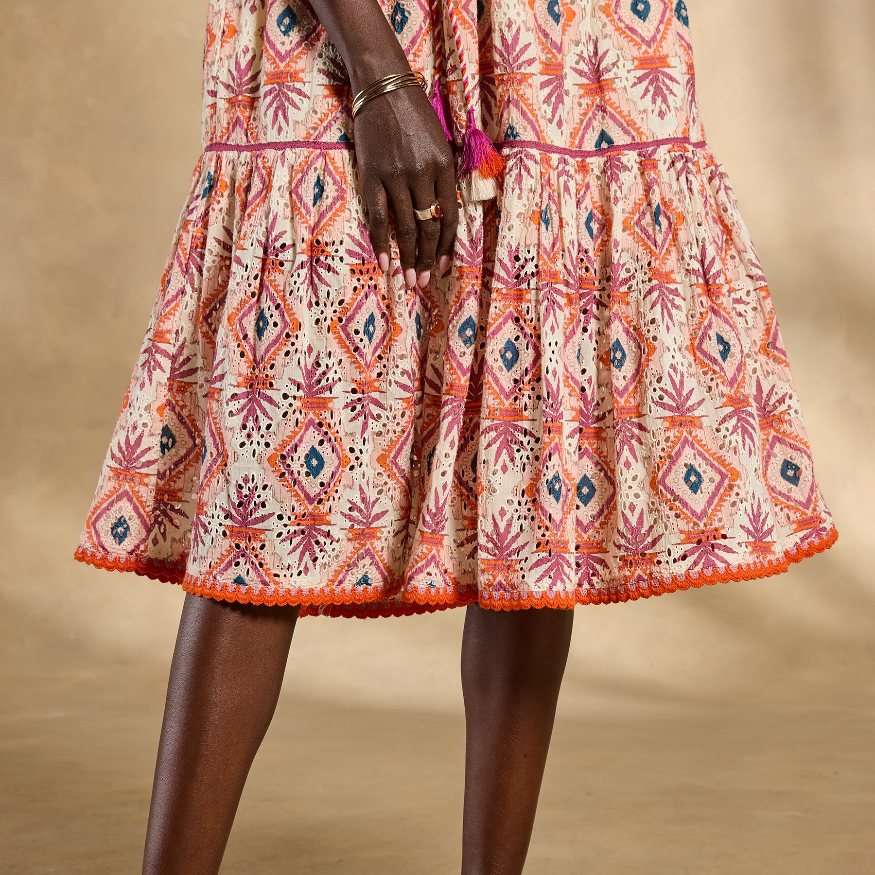 Airy eyelet PLUS a punchy print—more is always more with our charming sleeveless Annetta Dress. Flattering notch neckline with crochet detail; removable rope belt with tassel. Fully lined. Cotton. Machine wash. Imported. Exclusive. Sizes XS (0-2). S (4-6). M (8-10). L (12-14). XL (16-18). XXL (20-22). Approx. 45l.