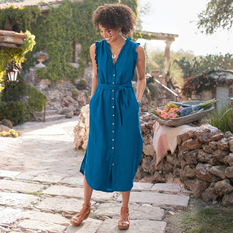 Sleeveless. two-pocket dress with shell button front. removable belt. deep side slits and ruffles at armholes and neckline. Partially lined. Linen/viscose. Machine wash. Imported. Exclusive. Sizes XS (0 to 2). S (4 to 6). M (8 to 10). L (12 to 14). XL (16 to 18). XXL (20 to 22). Approx. 51L.