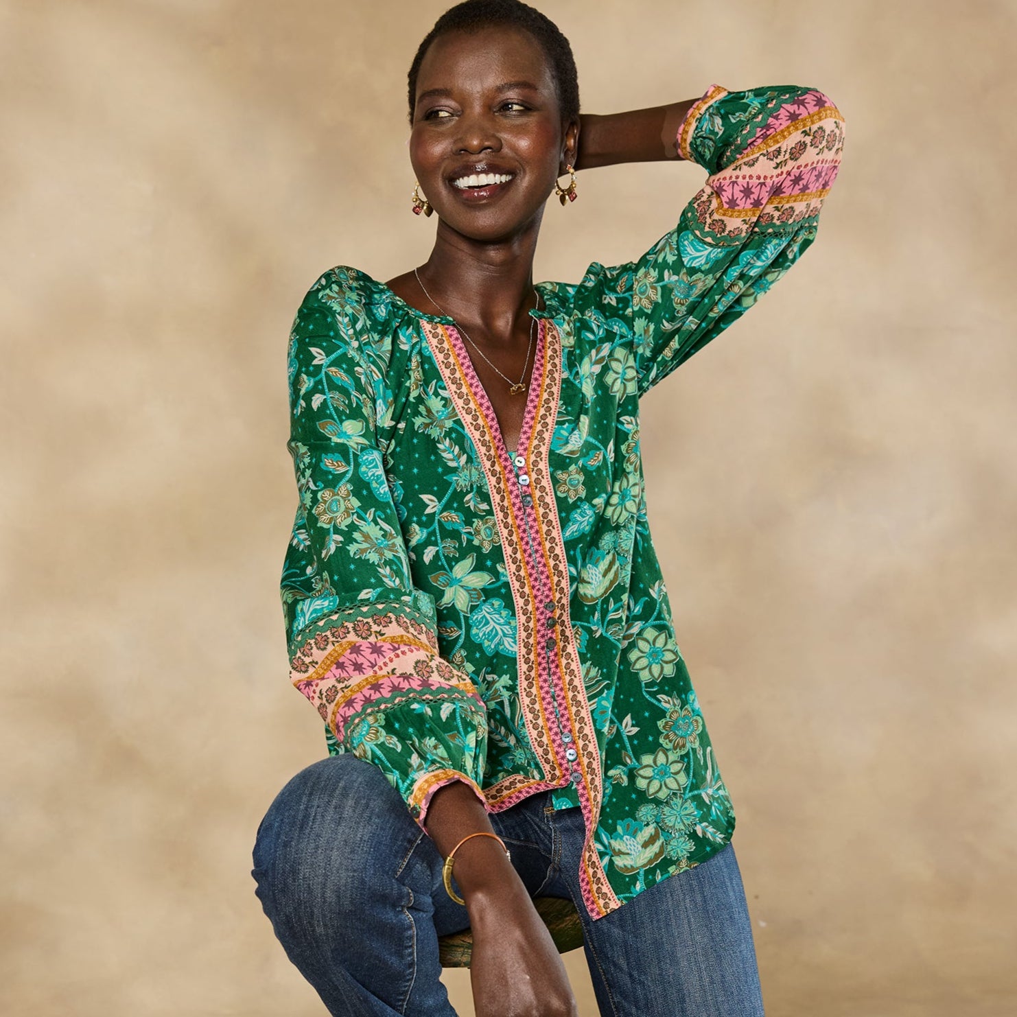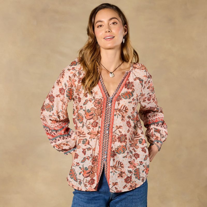 Opulent florals and elegant border prints combine to intoxicating effect. Sleek. body-skimming fit with flattering V-neck and three trios of delicate buttons. Cotton/silk. Machine wash. Imported. Exclusive. Sizes XS (0–2). S (4–6). M (8–10). L (12–14). XL (16–18). XXL (20–22). Approx. 26.5l.