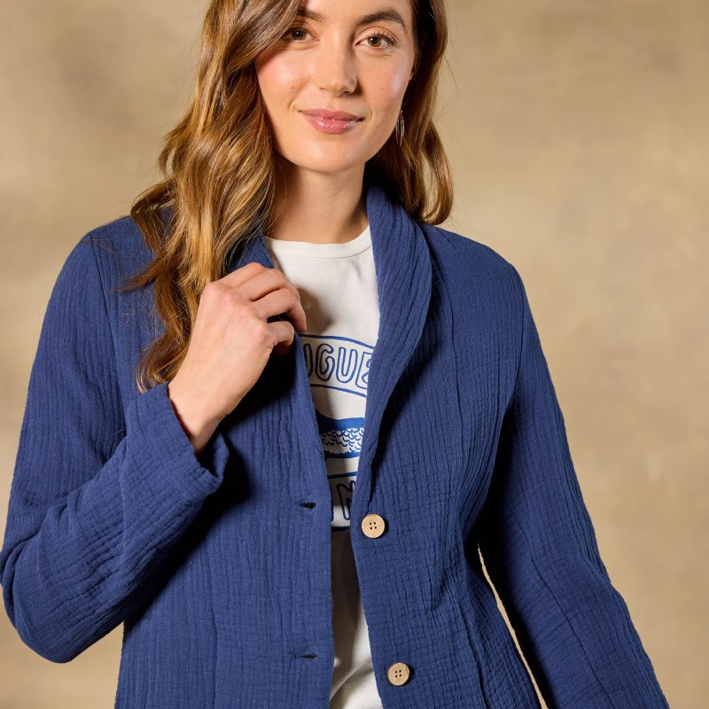 The subtle structure of a blazer PLUS the softness of four-ply brushed gauze: our Blake Blazer really is the best of both worlds. Wear with the sleeves rolled up or down; this classic-fit light layer has a shawl collar. SLASH pockets and wood buttons. CONTENT. CARE. Imported. Sizes XS (0–2). S (4–6). M (8–10). L (12–14). XL (16–18). XXL (20–22). Approx. 23.75l.