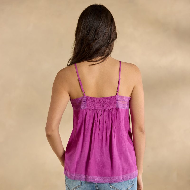 Our soft camisole is graced with feminine lace at the V-neck and hem—plus flattering pintucks at the center front. Elastic smocking at the back for the perfect fit. Adjustable straps. Viscose. Machine wash. Imported. Exclusive. Sizes XS (0–2). S (4–6). M (8–10). L (12–14). XL (16–18). XXL (20–22). Approx. 24l.
