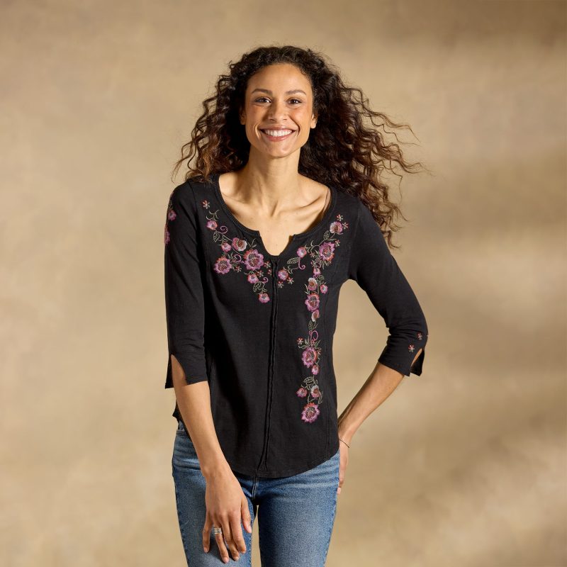 Lush floral embroidery blooms across our Cuyamaca top with raw-edge details. novelty notch neckline and flattering princess seams. Elbow length sleeves. Cotton. Machine wash. Imported. Exclusive. Sizes XXS (00). XS (0–2). S (4–6). M (8–10). L (12–14). XL (16–18). Approx. 22l.