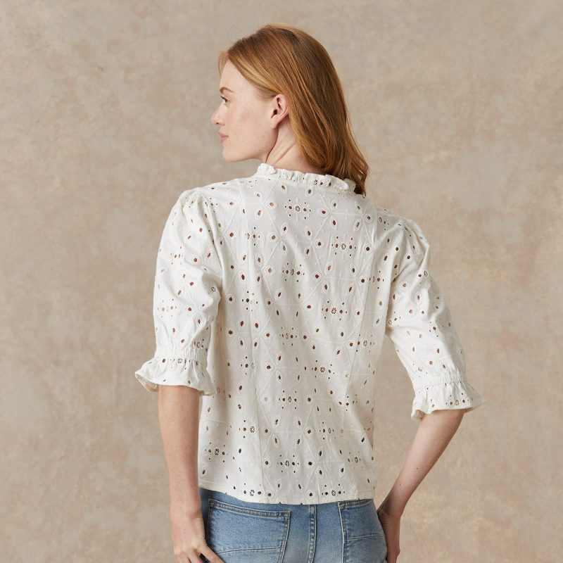 This breezy knit blouse features all-over eyelet embroidery and a ruffled collar and sleeves. Cotton. Machine wash. Imported. Sizes XS (0-2). S (4-6). M (8-10). L (12-14). XL (16-18). XXL (20-22). Approx. 22.5l.