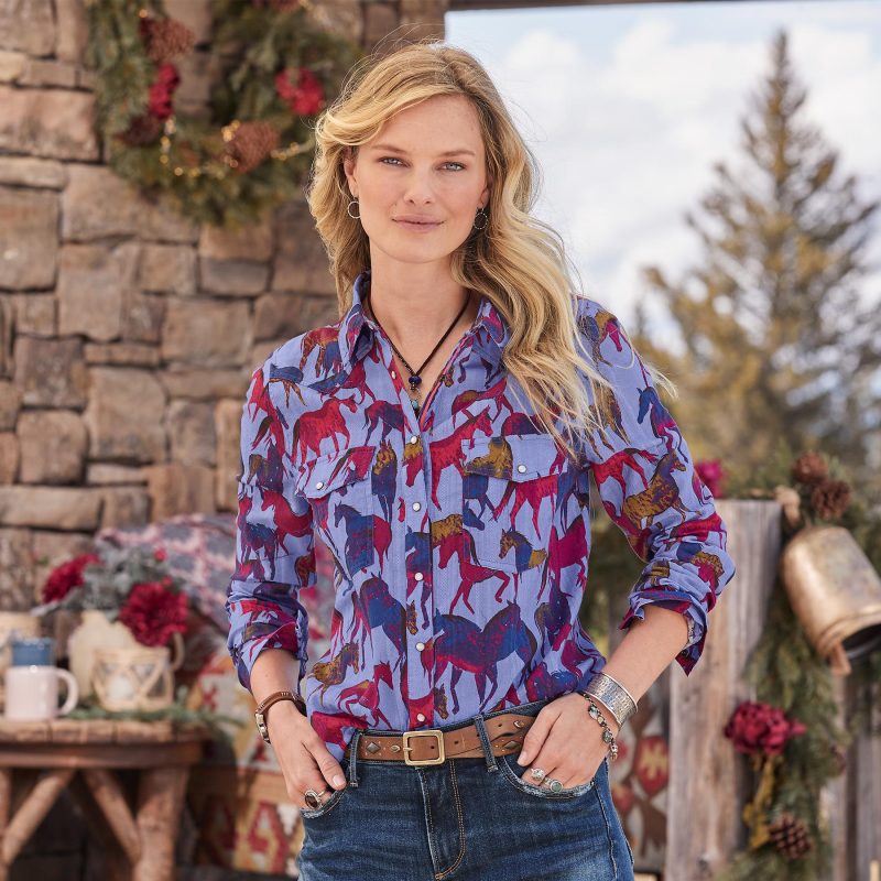 Western-inspired. pearlized snap front shirt in the prettiest cotton dobby with equestrian print. Two chest pockets. lace detail at back neck. grosgrain ribbon at placket. Western back yoke and shirttail hem. Machine wash. Imported. Exclusive. Sizes XXS (00). XS (0?C2). S (4?C6). M (8?C10). L (12?C14). XL (16?C18). Approx. 25l.