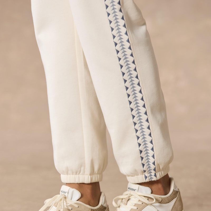 Our stylish and comfortable joggers in a straight leg fit are so beautiful and classy in fleece with stunning geometric embroidery at the side seams. on seam welt pockets and drawstrings at the elastic waist for the perfect fit. Cotton/polyester. Machine wash. Imported. Exclusive. Sizes XS (0–2). S (4–6). M (8–10). L (12–14). XL (16–18). XXL (20–22). 28 inseam.