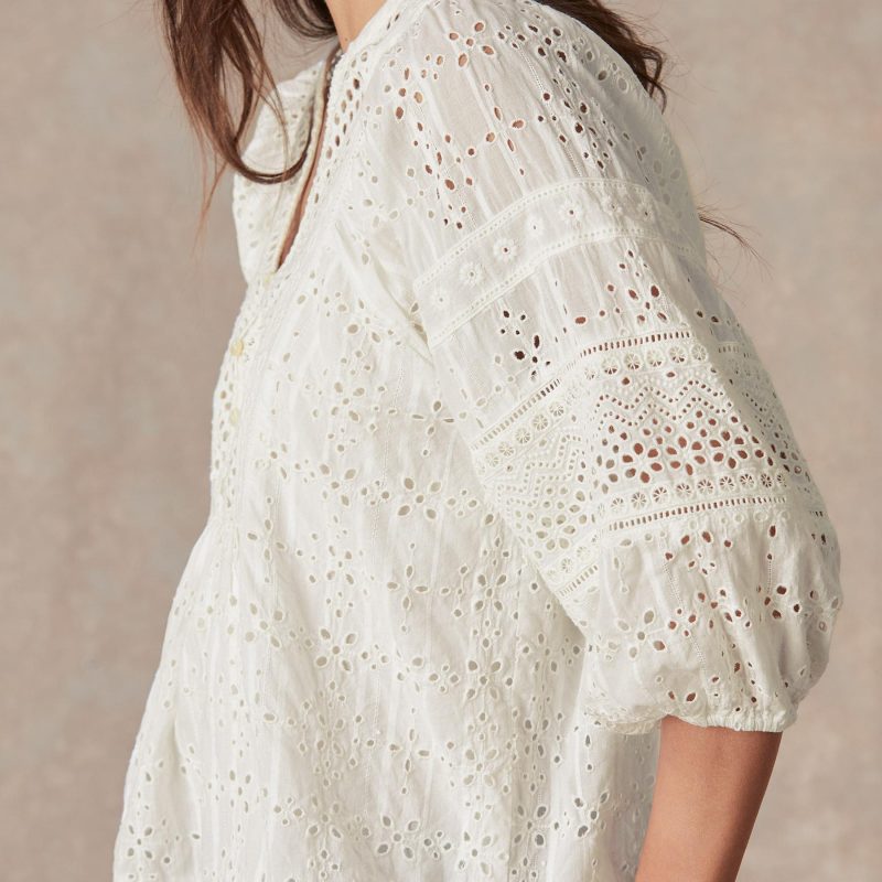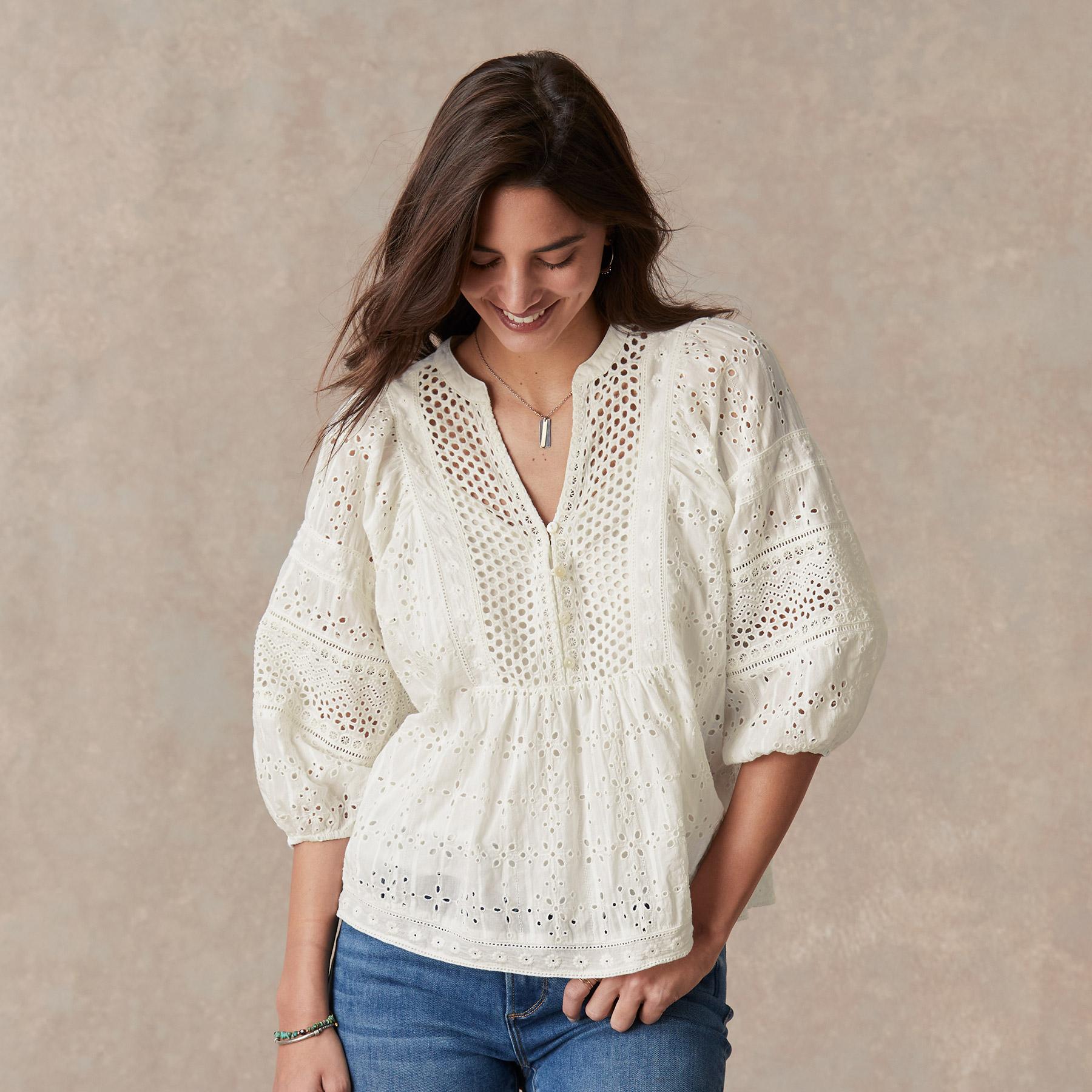 Tonal eyelet embroidery brings life to our relaxed top boasting bold. voluminous sleeves with elastic cuffs. ladder lace insets and shell buttons at the henley placket. Camisole included. Cotton. Machine wash. Imported. Exclusive. Sizes XXS (00). XS (0?C2). S (4?C6). M (8?C10). L (12?C14). XL (16?C18). Approx. 23.5l.