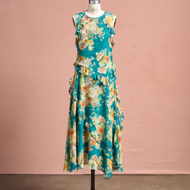 A gorgeous floral print enchants on our romantic dress. with angled. fluttery ruffles. asymmetrical hem. deep side slit. smocked neckline and keyhole button back. Fully lined. Viscose. Machine wash. Imported. Exclusive. Sizes XS (0-2). S (4-6). M (8-10). L (12-14). XL (16-18). XXL (20-22). Approx. 43.5l.