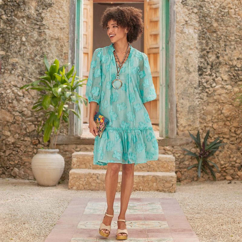 Make a statement in our stunning. easy popover jacquard dress with notch neckline and lovely ruffle detail. pintucking at the center front for a feminine touch and puff sleeves with encased elastic cuffs. Ruffle tiered hem. Cotton/Viscose/Nylon. Machine wash. Imported. Exclusive. Sizes XS (0-2). S (4-6). M (8-10). L (12-14). XL (16-18). XXL (20-22). Approx. 38l.