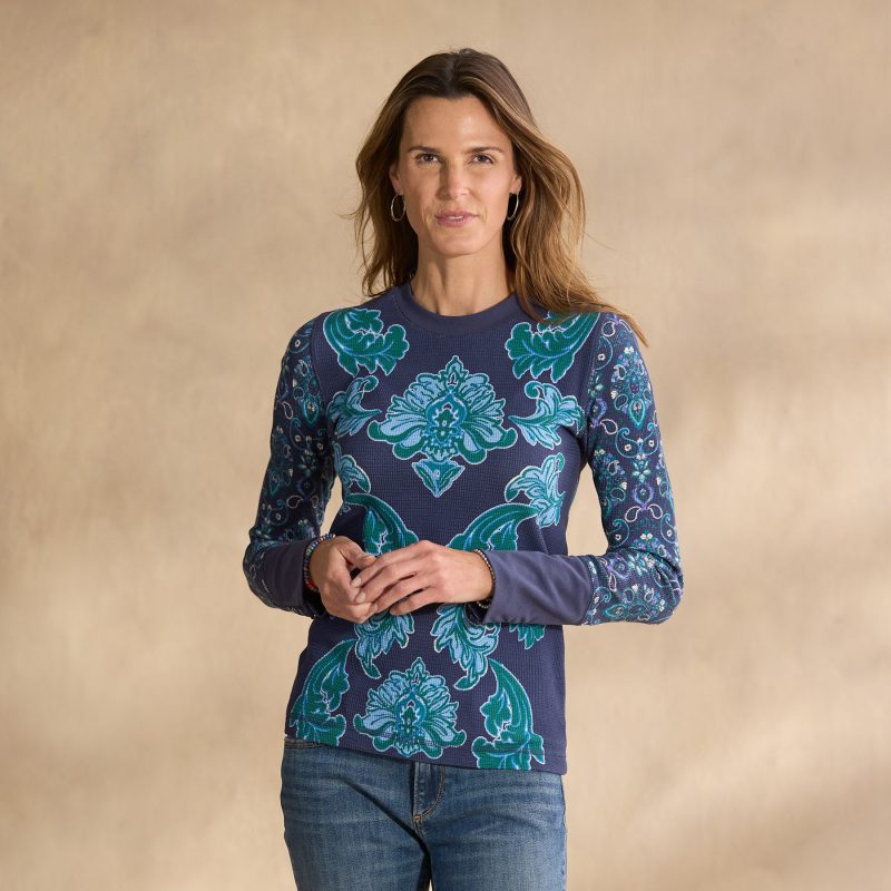 Inspired by a Sundance favorite. our placed print waffle thermal in a melody of medallion designs is sure to delight. Velvet cuff details with metal button placket. Cotton/spandex. Machine wash. Imported. Exclusive. Sizes XS (0??). S (4??). M (8??0). L (12??4). XL (16??8). XXL (20??2). Approx. 25.5l.