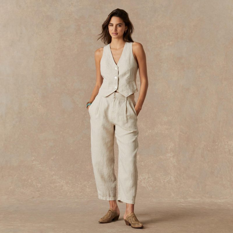 Perfect for summer wear. these handcrafted linen pants have a wide leg. single pleat and slash pockets. Linen. Machine wash. Made in USA. Sizes XS (0-2). S (4-6). M (8-10). L (12-14). Approx. 25.5 inseam. 14 rise. 7.5 leg opening.