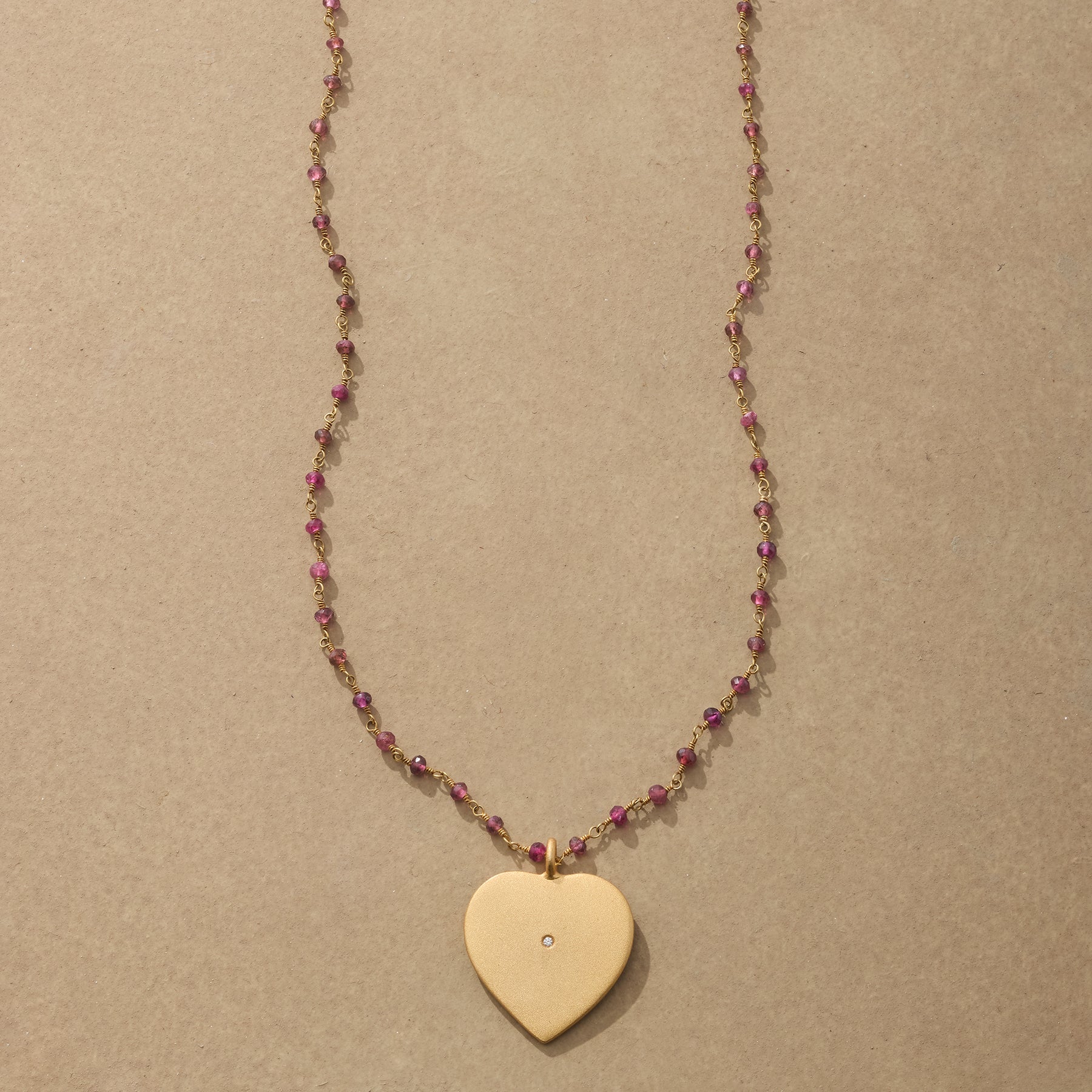 Links of mystic garnet lead to a heart of gold. a single diamond dazzling at its center. Handcrafted of 14kt gold plate. Brass spring ring clasp. Made in USA. 19-1/2l. 1-3/8 drop.