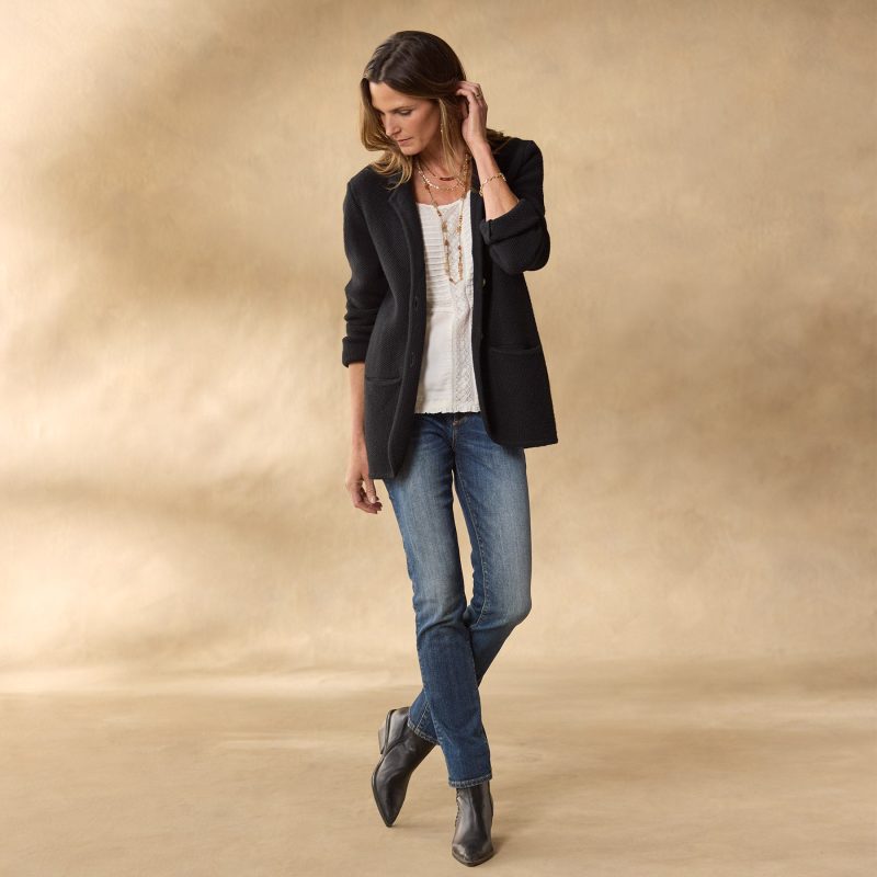 A new classic. our honeycomb stitch sweater blazer. Delightfully textural. with lapel collar. tubular details at cuffs and hem. faux horn buttons. two front pockets. Three-button cuffs. Cotton/nylon/wool. Hand wash. Imported. Exclusive. Sizes XXS (00). XS (0–2). S (4–6). M (8–10). L (12–14). XL (16–18). Approx. 25.5l.