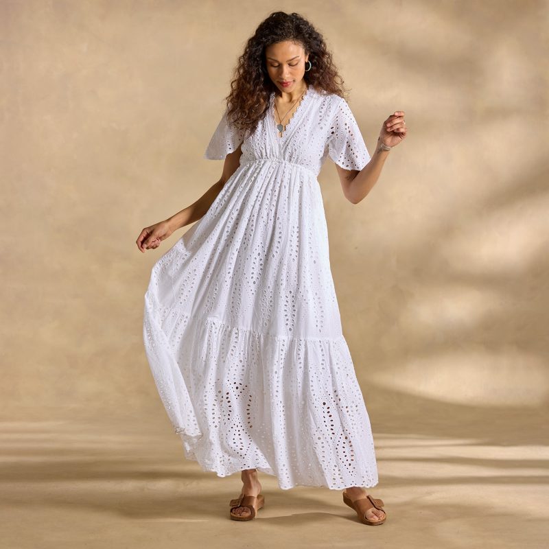 Nothing says weekend like crisp eyelet from head to toe. Fresh and feminine. our essential Juno maxi features all-over eyelet with an easy elastic waistband. flirty flutter sleeves and pretty lace trim at the neckline. Cotton. Machine wash. Imported. Exclusive. Sizes XS (0-2). S (4-6). M (8-10). L (12-14). XL (16-18). XXL (20-22). Approx. 54l.