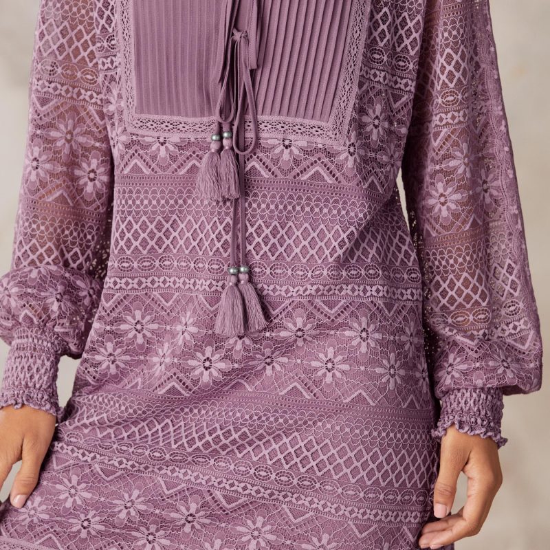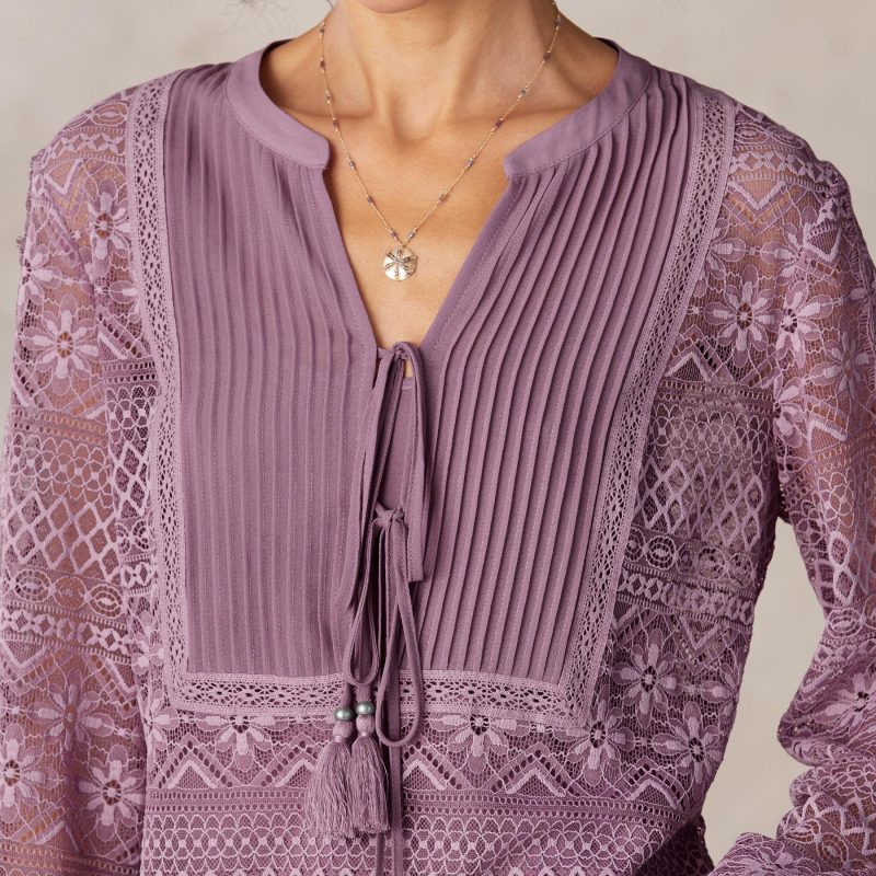 You’re a vision in our allover lace shift dress with chiffon pintuck detail. Flounce hem. tasseled neckline ties. smocked cuffs and full sleeves. Popover styling with separate slip. Nylon. Hand wash. Imported. Exclusive. Sizes XS (0-2). S (4-6). M (8-10). L (12-14). XL (16-18). XXL (20-22). Approx. 38.5l.
