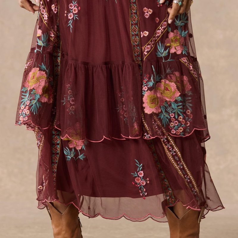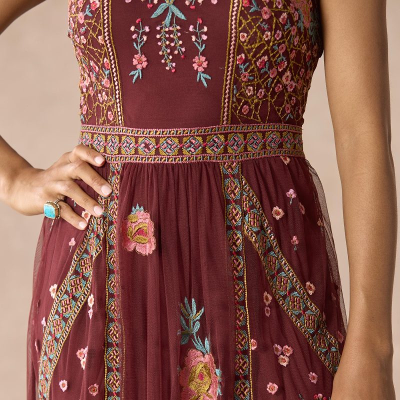 Our lovely fit and flare embroidered mesh dress features pretty florals mixed with geometric embroidery and a beautiful jewel neckline. Side zipper for an easy fit. Nylon. Hand wash. Imported. Exclusive. Sizes XS (0?C2). S (4?C6). M (8?C10). L (12?C14). XL (16?C18). XXL (20?C22). Approx. 54l.