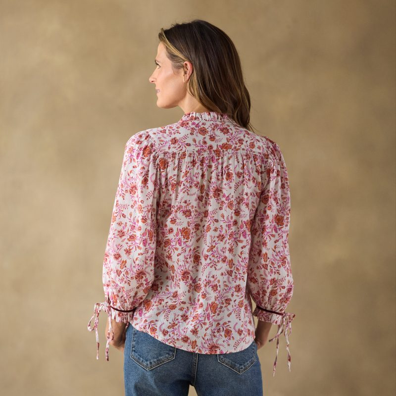 So easy—our feminine top is as beautiful as it is relaxed with button-down front. ruffle details at the neckline and bracelet length cuffs. contrast velvet trim and two lovely rows of smocking. Adjustable ties at the cuffs. Cotton. Machine wash. Imported. Exclusive. Sizes XS (0–2). S (4–6). M (8–10). L (12–14). XL (16–18). XXL (20–22). Approx. 25l.