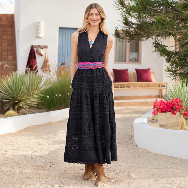 Our sleeveless maxi dress is adorned with beautiful crochet lace throughout. With pintucks on the skirt. a surplice neckline. a surplice back with ties. smocked waist and side seam pockets. Lined. Cotton. Machine wash. Imported. Exclusive. Sizes XXS (00). XS (0?C2). S (4?C6). M (8?C10). L (12?C14). XL (16?C18). Approx. 50.75l.