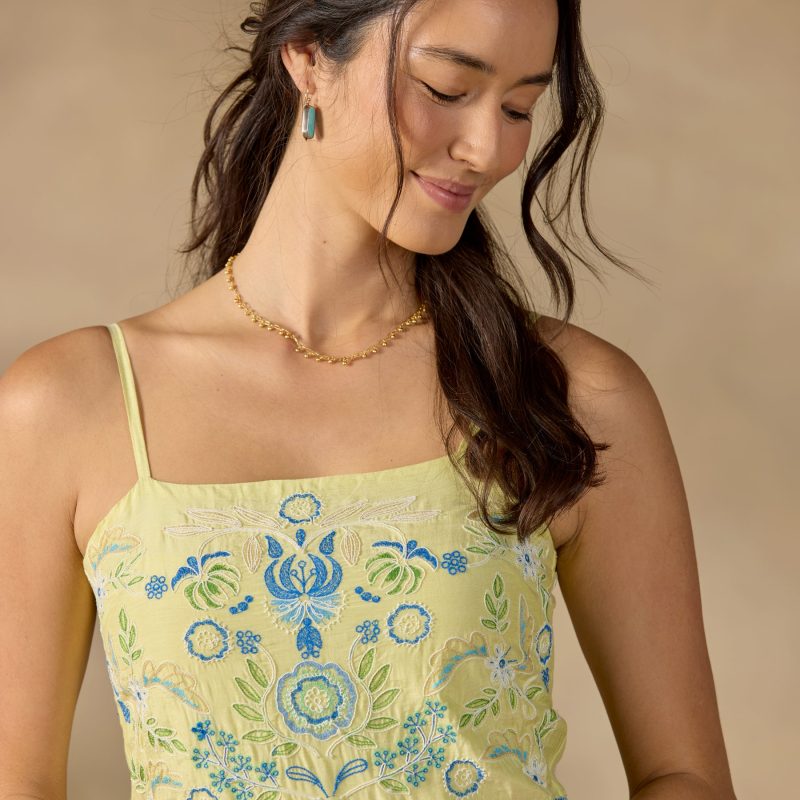 As bright and tangy as a sip of limoncello. our strappy Salina maxi is sure to be a standout all season—featuring delicate floral and geometric embroidery over three lovely tiers. Adjustable straps. side-seam pockets and center back zipper with smocking for easy fit. Fully lined. Silk/cotton. Machine wash. Imported. Exclusive. Sizes XS (0-2). S (4-6). M (8-10). L (12-14). XL (16-18). XXL (20-22). Approx. 54l.
