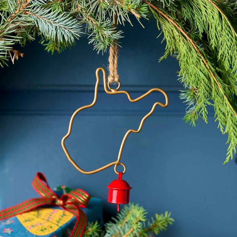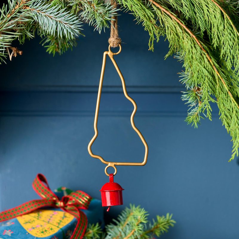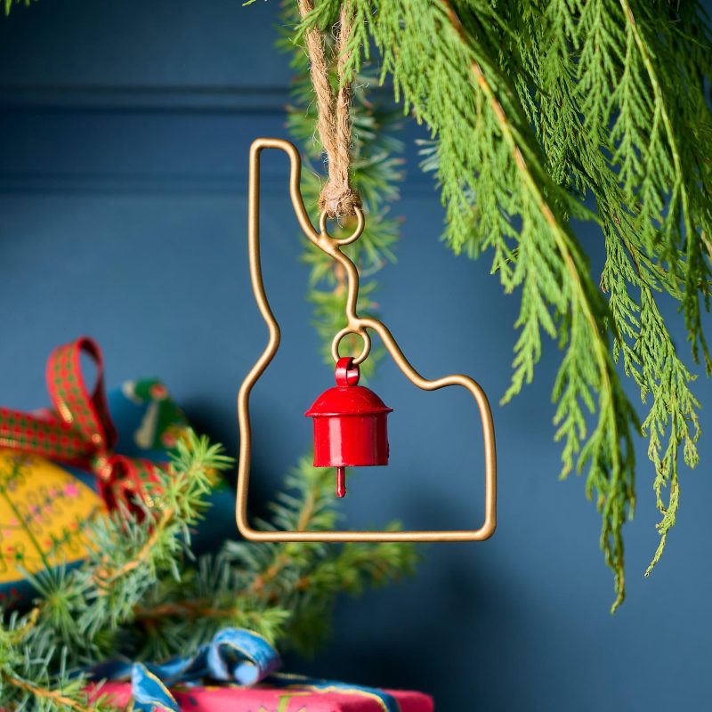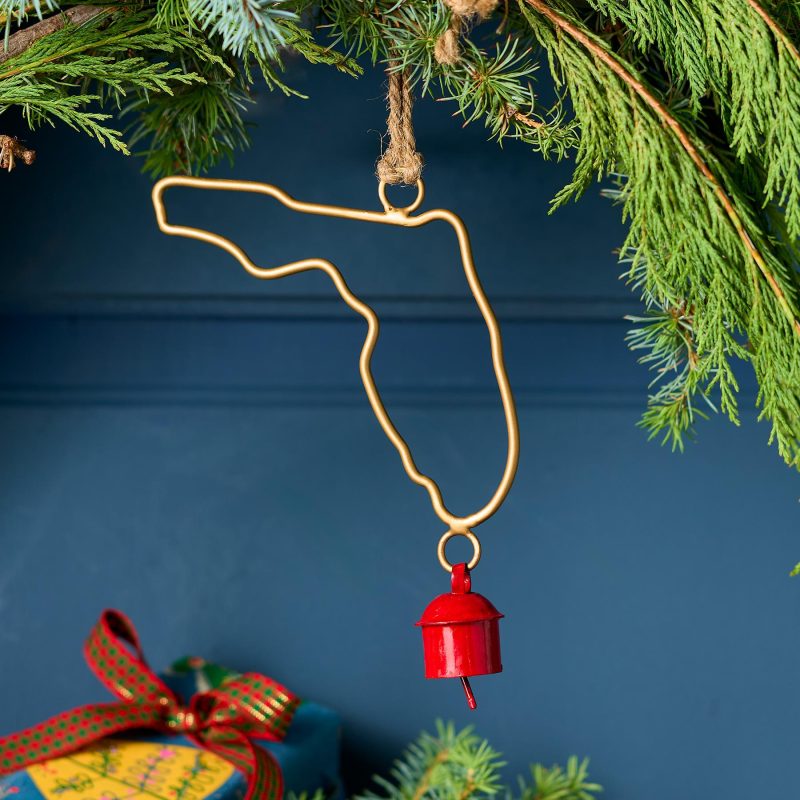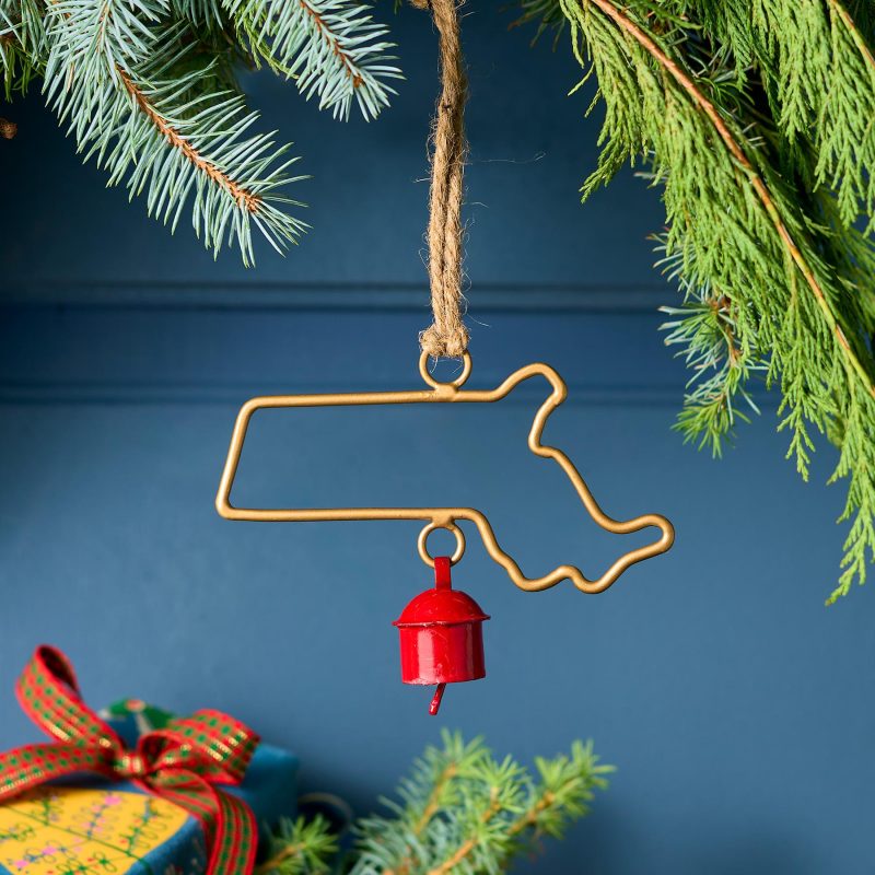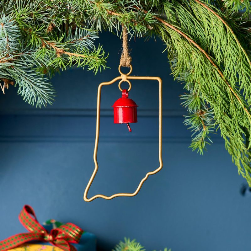 Represent your favorite state on the tree this year with a handcrafted ornament outlined and shaped to artisan perfection. Each U.S. state shape is intricately created and includes an expertly crafted and tuned bell. All 50 states available. Brass/iron/jute. Imported. Exclusive. Sizes vary depending on which state shape is chosen. range from 2w to 4.75w x 2l to 4.75l.