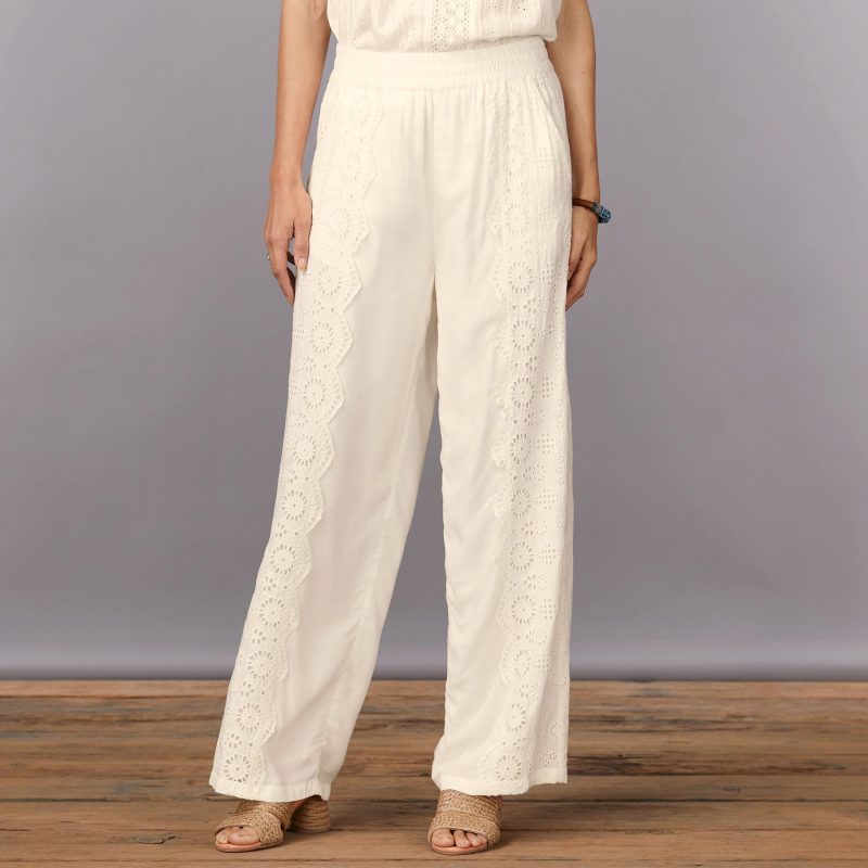 Simply sophisticated. elastic waist. wide-leg pants with feminine side eyelet detail and two pockets. Fully lined. Modal/viscose. Machine wash. Imported. Exclusive. Sizes XS (0?C2). S (4?C6). M (8?C10). L (12?C14). XL (16?C18). XXL (20?C22). 29 inseam.