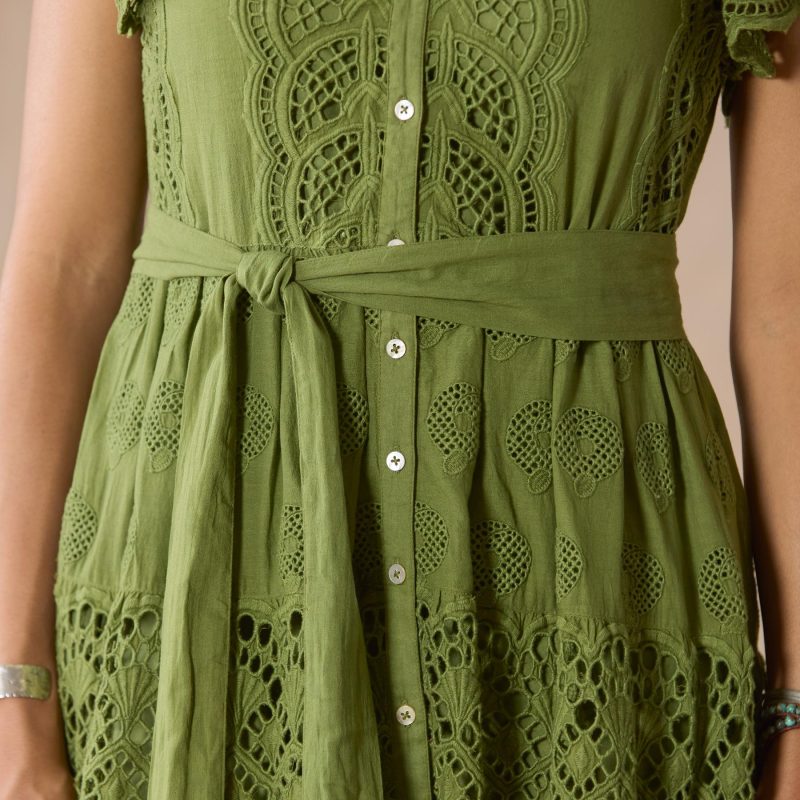 Allover embroidery and soft eyelet tiers add the most feminine touch to our sophisticated V-neck dress with scalloped ruffles at the sleeves. button front placket and a removable belt. Separate slip included. side seam pockets. Cotton. Hand wash. Imported. Exclusive. Sizes XXS (00). XS (0–2). S (4–6). M (8–10). L (12–14). XL (16–18). Approx. 46l.