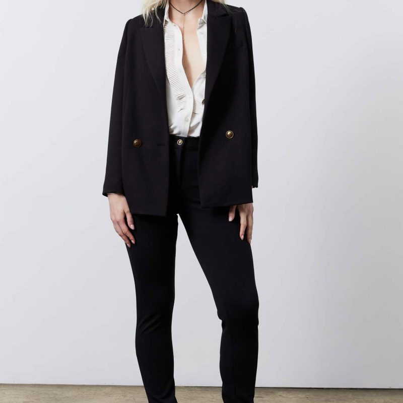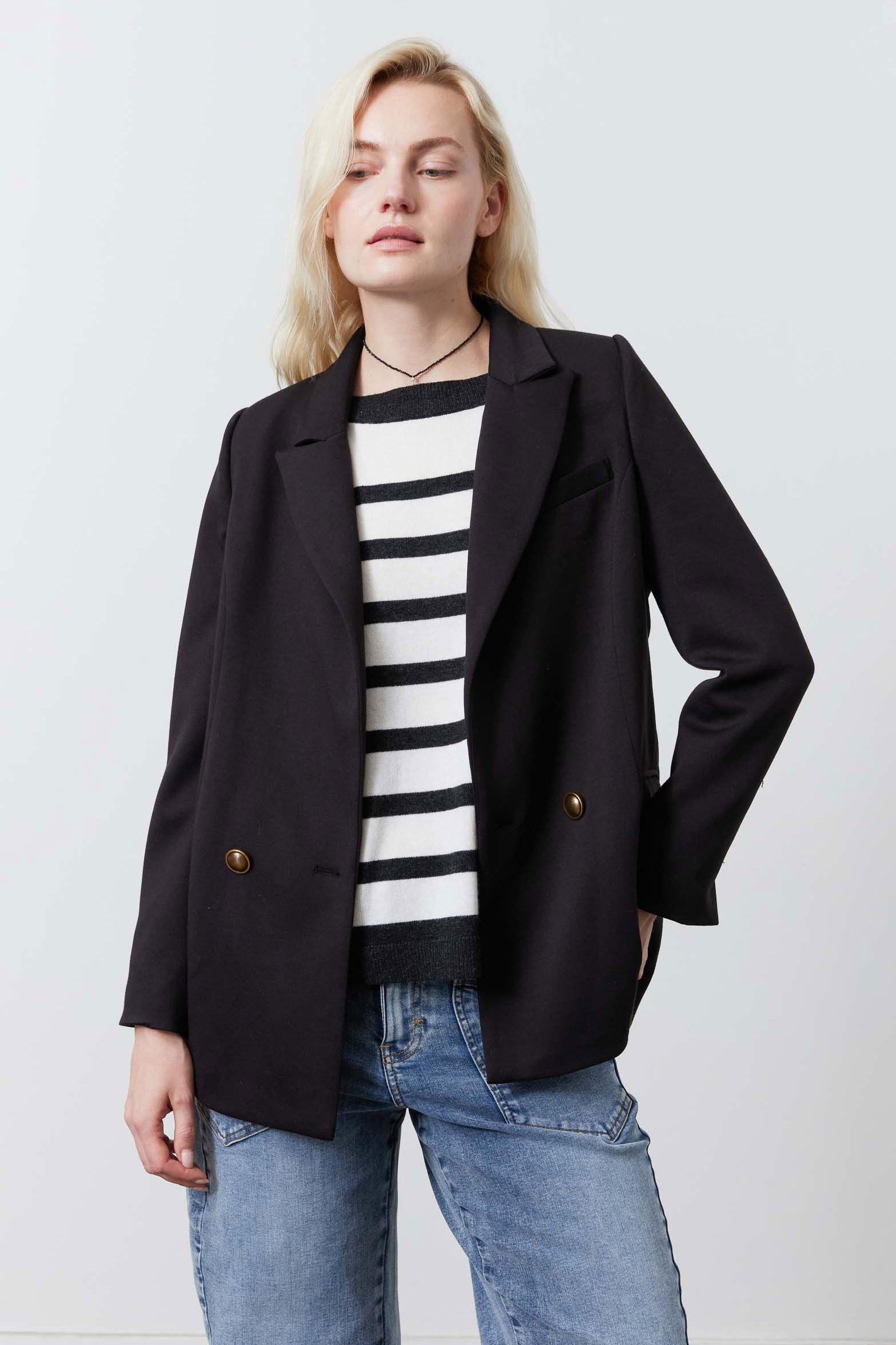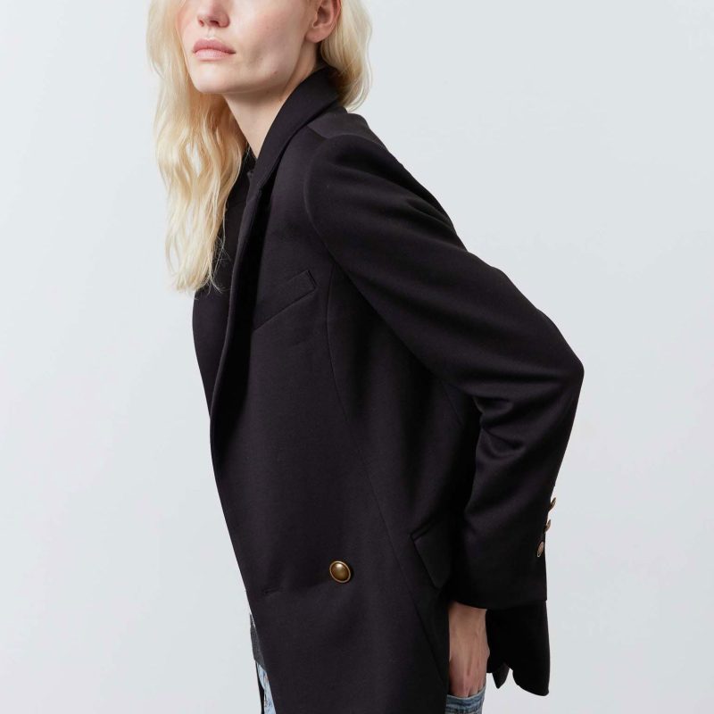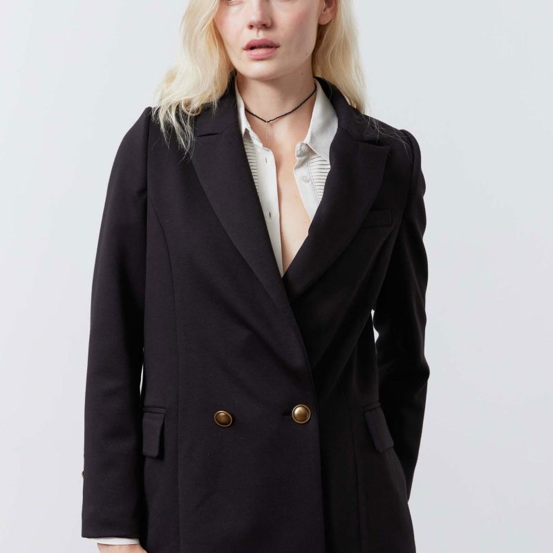 A relaxed take on classic tailoring. This double-breasted blazer is designed with a slightly elongated silhouette and soft structure. giving it an effortless. borrowed-from-the-boys feel while still looking sharp and put together.
