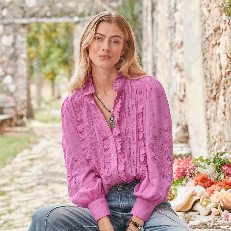 An oh-so-feminine shell button-up shirt. with whimsical embroidered polka dots. medallion embroidery and openwork. pintucks and lace inserts. scalloped ruffle detail and bishop sleeves. Cotton. Machine wash. Imported. Exclusive. Sizes XS (0-2). S (4-6). M (8-10). L (12-14). XL (16-18). XXL (20-22). Approx. 26l.