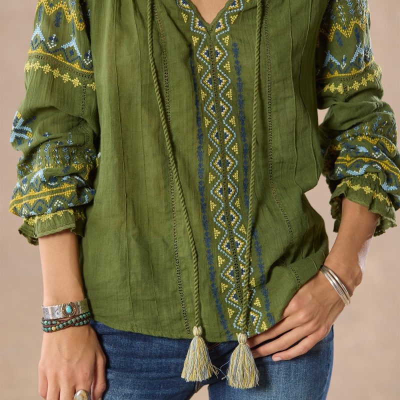Our stylish peasant top is so flowy and breezy. cross stitched with colorful embroidery and finished with special lace insets. Elastic smocking at the cuff and notch neckline. colorful tassel ties. Cotton. Hand wash. Imported. Exclusive. Sizes XS (0–2). S (4–6). M (8–10). L (12–14). XL (16–18). XXL (20–22). Approx. 25l.